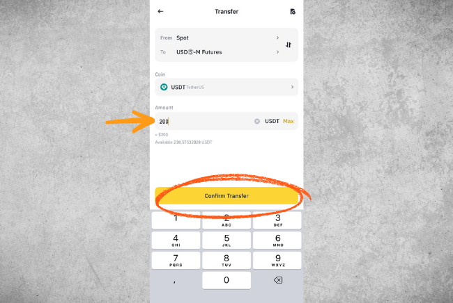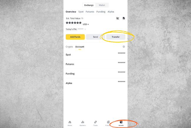 First, we need to transfer funds to Futures, so we go to Binance, click on “Assets,” and then select “Transfer.”
