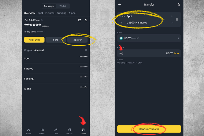 Select Spot at the top and Futures at the bottom, enter the amount (for example, $100), and click Confirm.