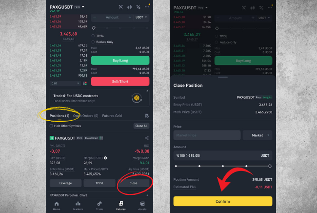 To exit the position, click CLOSE and then CONFIRM to close it.